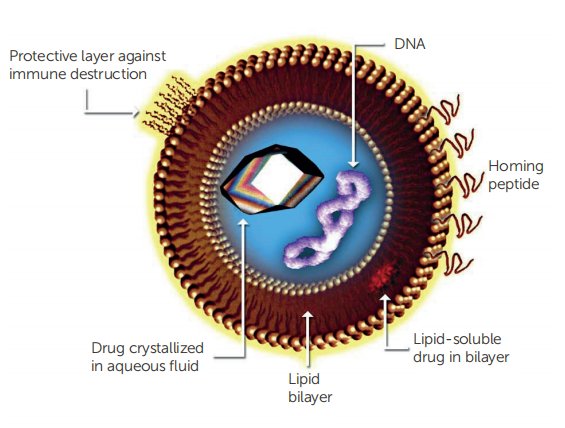 Doxil(盐酸多柔比星脂质体)是第一批通过批准使用,是一种重新配置的阿霉素。阿霉素药品在聚乙二醇(PEG)包覆的脂质体的亲水袋。聚乙二醇有助于避免免疫系统的检测和破坏,提高稳定性,延长循环中的半衰期。 脂质体的其他应用包括:生物技术(siRNA[小干扰核糖核酸]传递、抗体传递)和美容(乳剂和乳膏等领域的应用)。