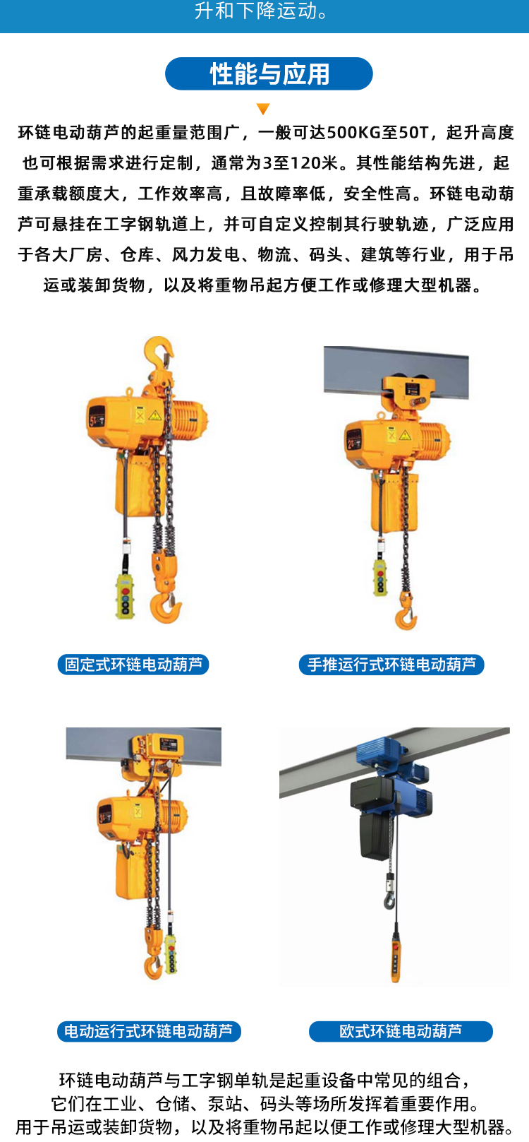 单梁起重机、双梁起重机、桥式起重机、门式起重机、欧式起重机、旋臂起重机、环链电动葫芦、钢丝绳电动葫芦