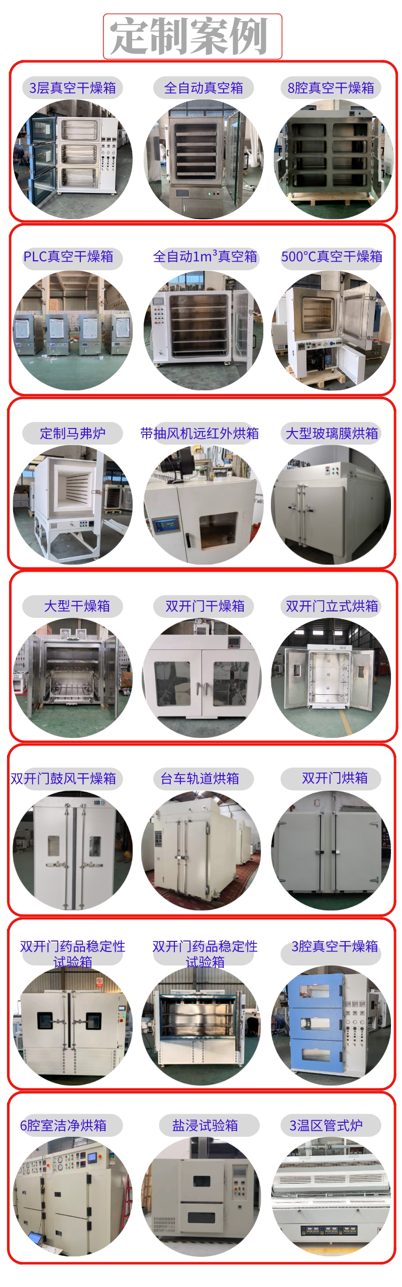 马弗炉、电阻炉、烧结炉、干燥箱、高温干燥箱、真空箱、高温真空箱、防爆真空箱、充氮真空箱、管式炉、气氛炉、二氧化碳培养箱、恒温恒湿箱、防爆干燥箱、防爆真空烤箱、洁净烘箱、超净工作台、真空保存箱、生化培养箱、霉菌培养箱、药品稳定性试验箱、高低温试验箱、高低温湿热试验箱
