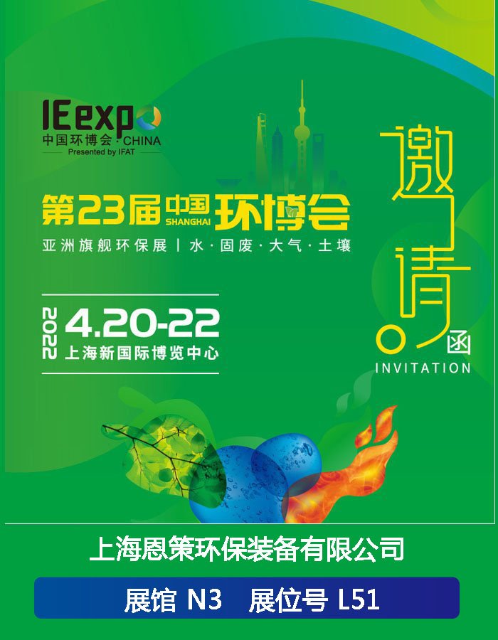 4月20-22日,一站式呈现环保全产业链解决方案,2022年第二十三届上海环博会将在上海新国际博览中心举行,上海恩策环保装备有限公司在N3展馆L51展位等您!