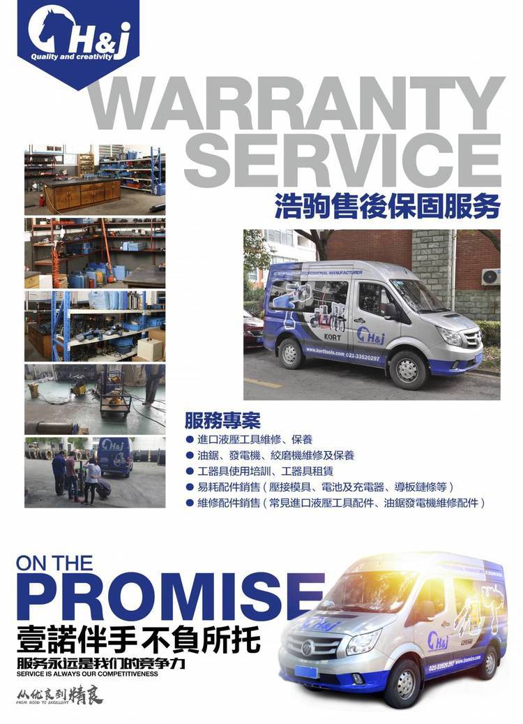 H&J 售後服務中心 是專業從事進口液壓工具、發電機、動力設備、油鋸、搶修車工具、應急救援設備、線路工具、起重設備 等大中國地區公用事業施工工具維保服務的服務單位,從事本行業已有十多年歷史。經過多年的共同努力,我們的發展有目共睹: 技術力量得到不斷沉澱,擁有長期、穩定、到位的維修服務管道。我們為您建立工具維修管理檔案,提供快捷、便利的維修保養服 務,使您高效生產。已與國內多家公用事業下屬單位簽訂維修保養協定,每年定期進行免費保養。服務團隊得到不斷壯大,我們在 全國主要省份均設有技術服務網點,提供上門維修服務,以 快的速度為客戶解決問題為 要務。服務品質得到不斷肯定。陸續 得到各國際 品牌的授權,為德國KLAUKE 特約維修中心,日本IZUMI特約維修中心,瑞典ELPRESS授權維修中心,澤滕ben田動力特 約維修中心,日本大洋(TAIYO) 發電機組特約維修中心, 日本SHINDAIWA油鋸特約維修中心等。定期有國外專家進行培訓。