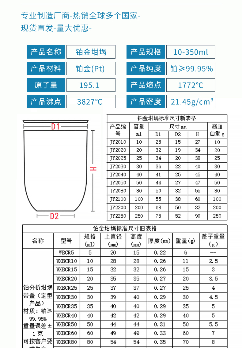 精炼贵重金属材料 25ml 规格齐全库存足 高纯铂坩埚 捷昱电子