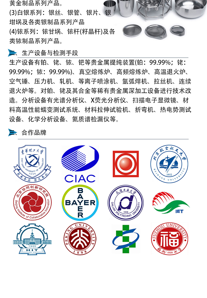 铂金坩埚、导电银浆、铂金颗粒、高纯度铂丝、铂金分析坩埚、实验室用铂颗粒