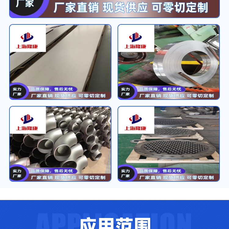 航空航天用、汽车用、家用电器用、机械制造用、轨道交通用、建筑装饰用、太阳能用、金属制品用、精密电子用、集装箱用、电梯用、卫生洁具用、压力容器用、核电用、化工设备用、餐饮厨具用、日用电器用、食用机械用、结构制管用等