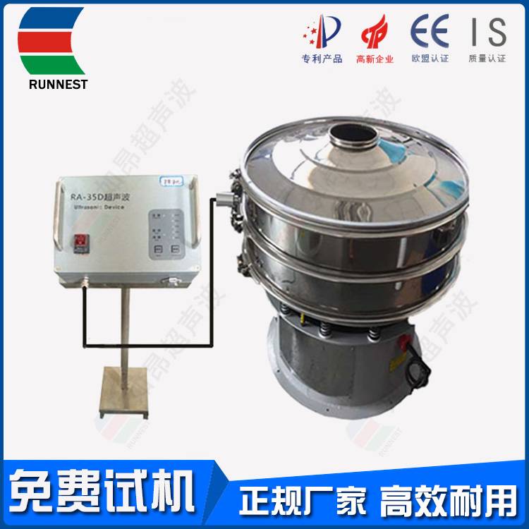 附加在RA系列超声波振动筛筛网上的超声振动波(机械波),使超微细粉体接受巨大的超声加速度,从而抑制粘附、摩擦、平降、楔入等堵网因素,提高筛分效益和清网效益。