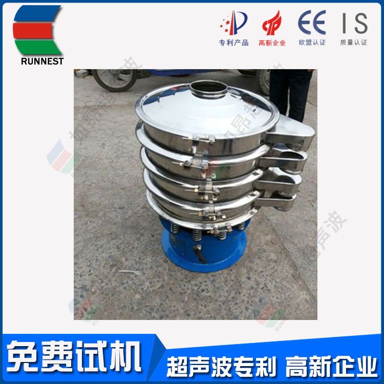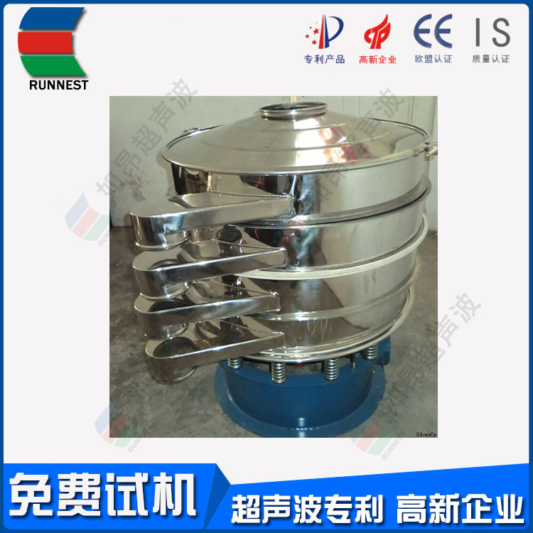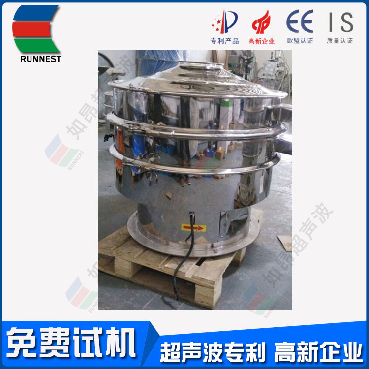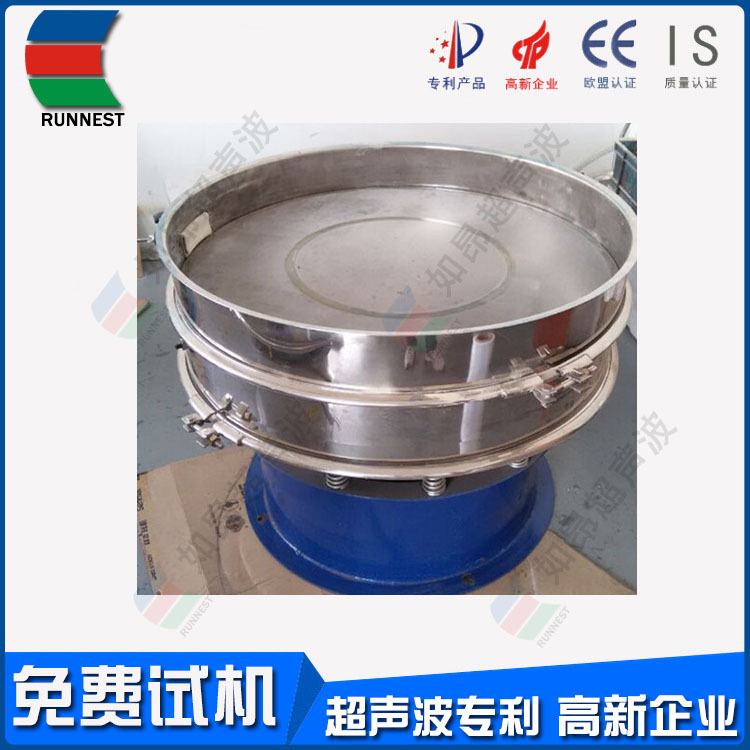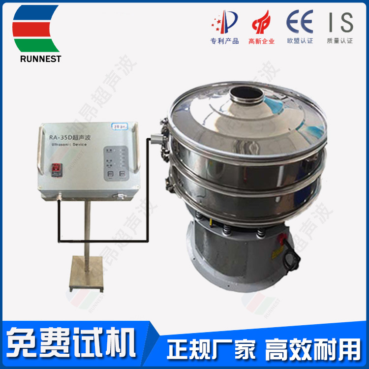 如昂超声波筛分系统由超声波谐振电源、振荡器、共振环组成。超声波谐振电源产生的高频电振荡由振荡器转换成高频三次元振荡波,这些振荡波传到共振环上使共振环产生共振,然后由共振环将振动均匀传输至筛面。筛网上的物料在做低频三次元振动的同时,叠加上超声波振动,既可防止网孔堵塞,又可提高筛分产量和质量。 RA系列超声波振动筛是本公司引进瑞士技术,研制出高精度、高稳定性的超声波振动筛分机。RA系列超声波振动筛使用自主设计的智能超声控制器,改变了单一频率带来不适应性和不可调性,真正实现数控与振动筛的有机结合,性能上达到和超过国际同类产品的水平、完全超越国内产品!RA系列超声波振动筛解决了强吸附性、易团聚、高静电、高精细、高密度、轻比重等筛分难题,具有**的性能!在性能上实现大的突破。RA系列超声波振动筛筛分精度可提高1-100%,产量可提高1-20倍;真正满足600目以上工业化生产需要!