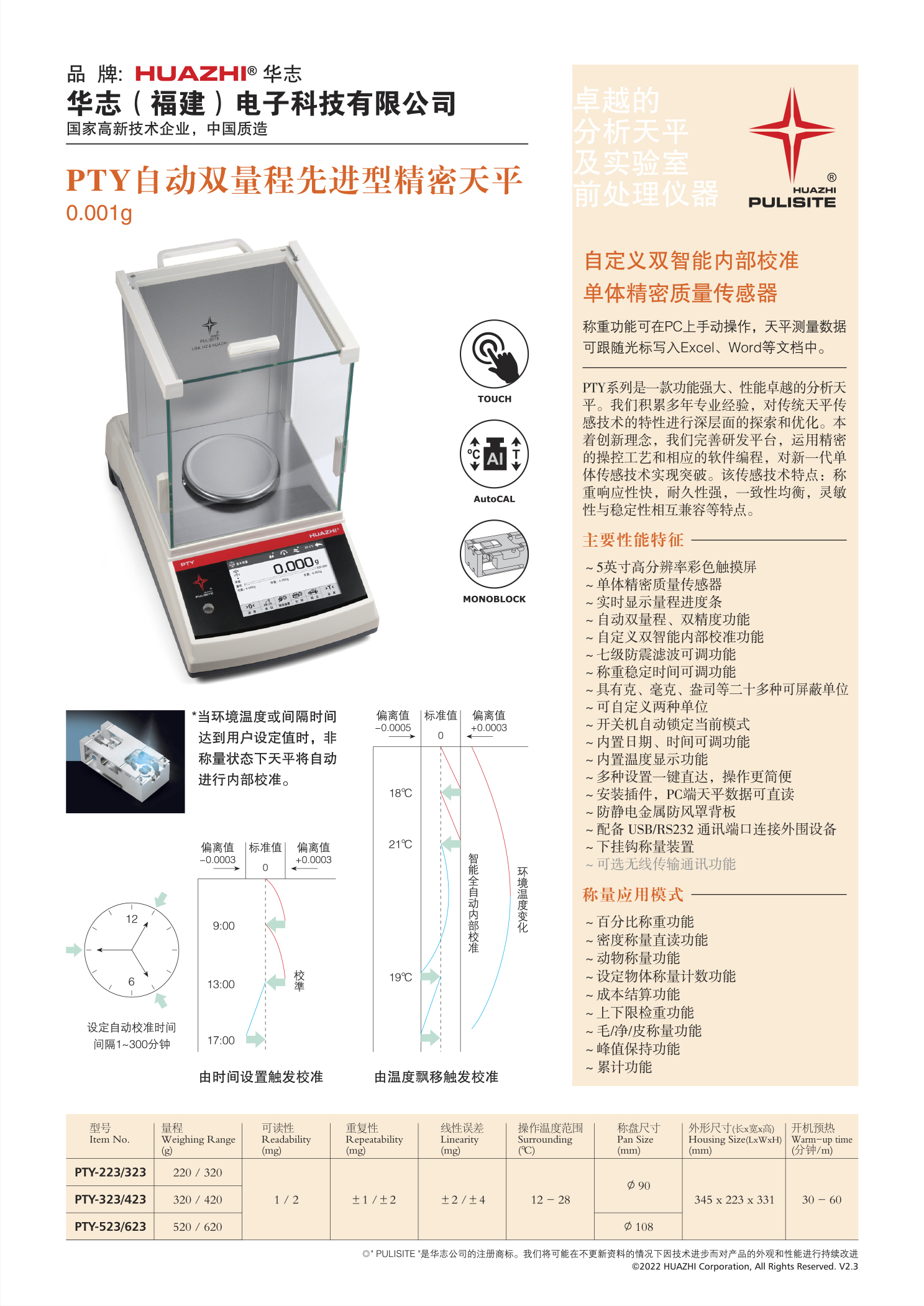 华志PTY-223/323双量程精密天平1mg 220g/1mg+320g/2mg 千分之一