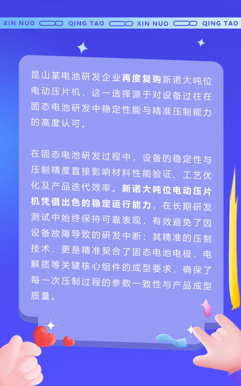昆山某电池研发企业再度复购新诺大吨位电动压片机,这一选择源于对设备过往在固态电池研发中稳定性能与精准压制能力的高度认可。在固态电池研发过程中,设备的稳定性与压制精度直接影响材料性能验证、工艺优化及产品迭代效率。新诺大吨位电动压片机凭借出色的稳定运行能力,在长期研发测试中始终保持可靠表现,有效避免了因设备故障导致的研发中断;其精准的压制技术,更是精准契合了固态电池电极、电解质等关键核心组件的成型要求,确保了每一次压制过程的参数一致性与产品成型质量。