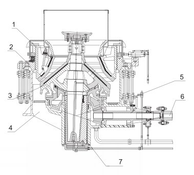 1.调整套部 2.支撑套部 3.破碎圆锥部 4.机架部 5.弹簧部 6.传动部 7.偏心套部