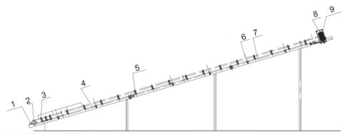 主要部件名称:1.拉紧装置 2.尾辊 3.托辊组 4.尾架 5.中间架 6.胶带 7.头架 8.头辊 9.传动装置