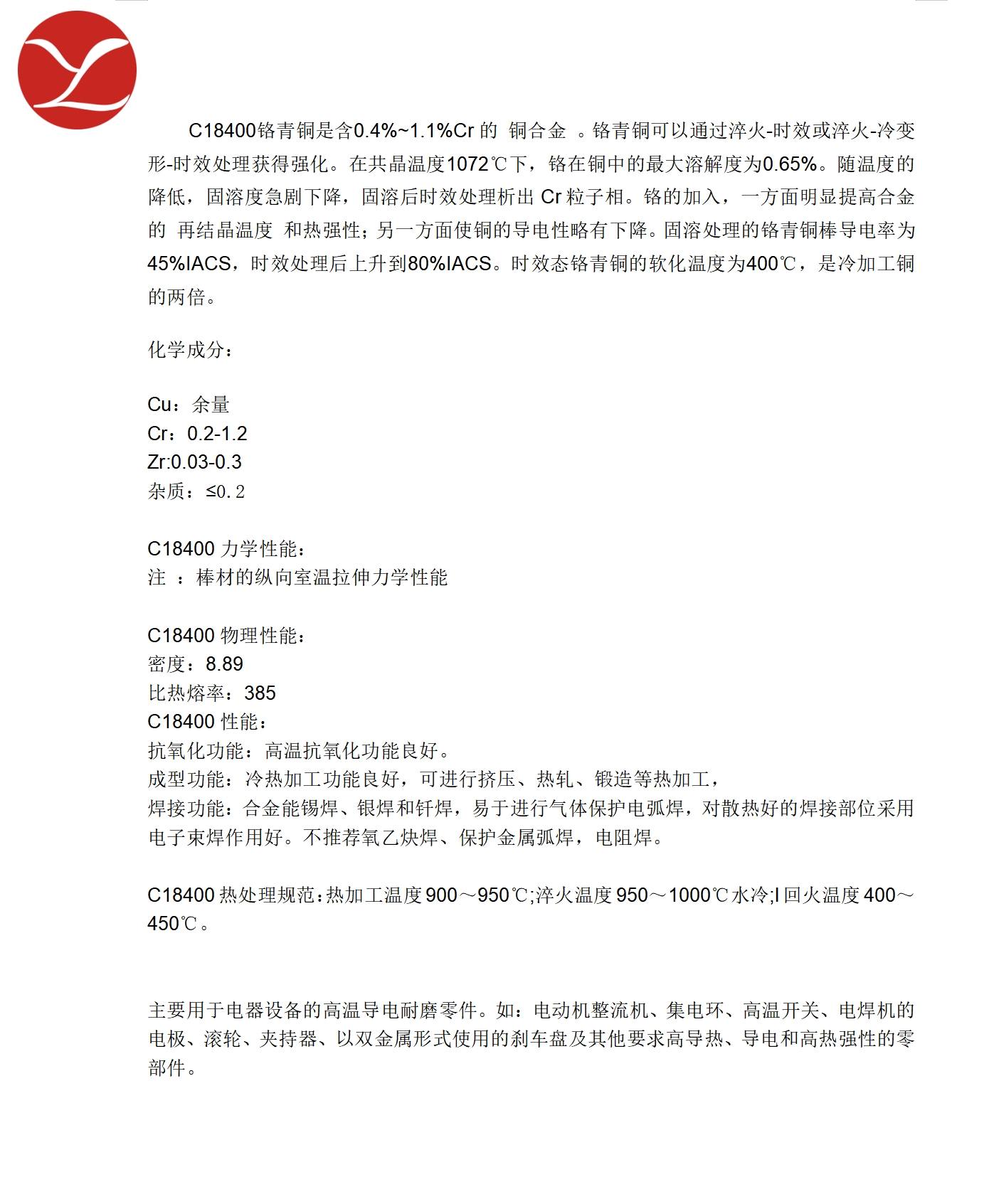 益励冶金:供应美标C18400铬锆铜板、铜棒、铜带焊接性能