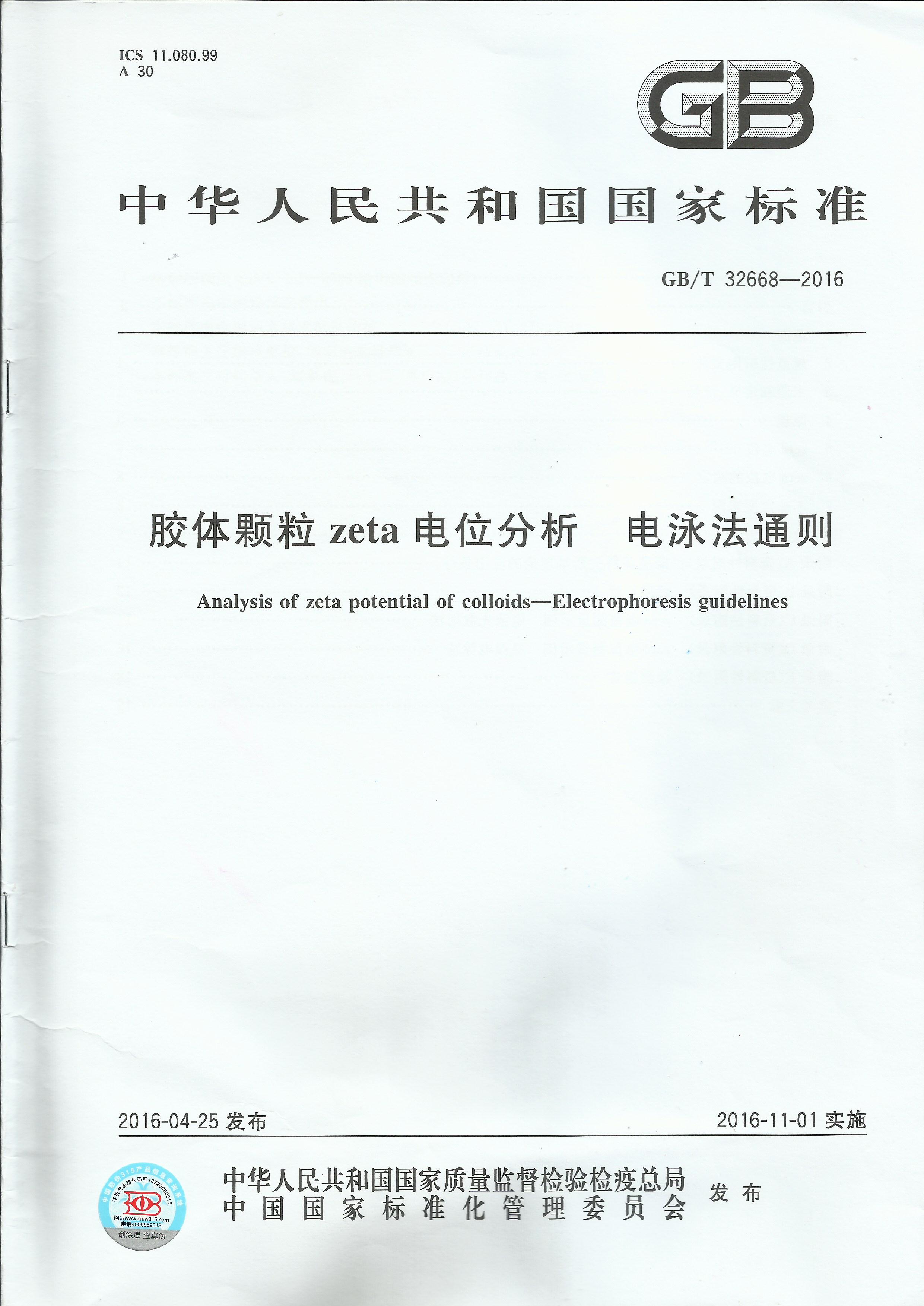 《胶体颗粒zeta电位分析 电泳法通则》国家标准发布,标准号:GB/T 32668-2016(详见本站下载专区),该国家标准于2016年11月1日起实施。
