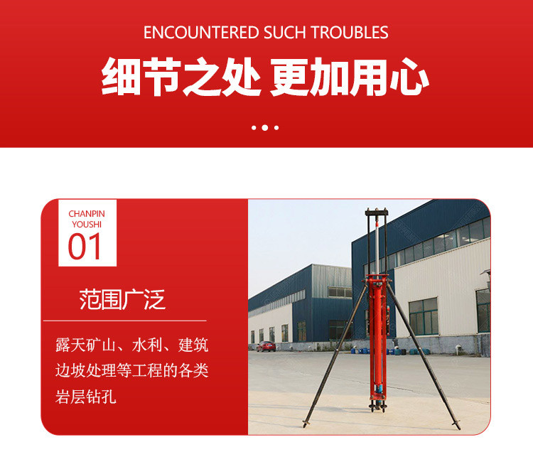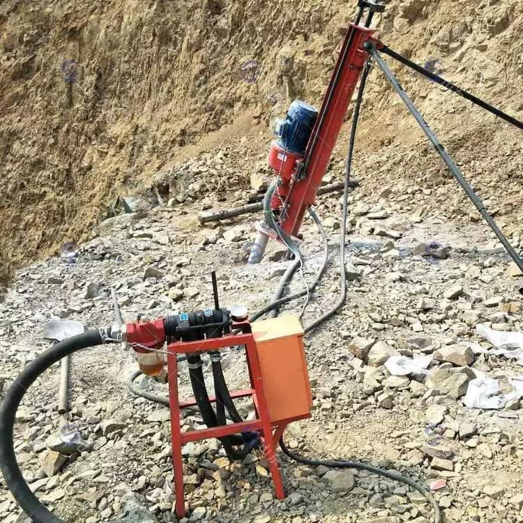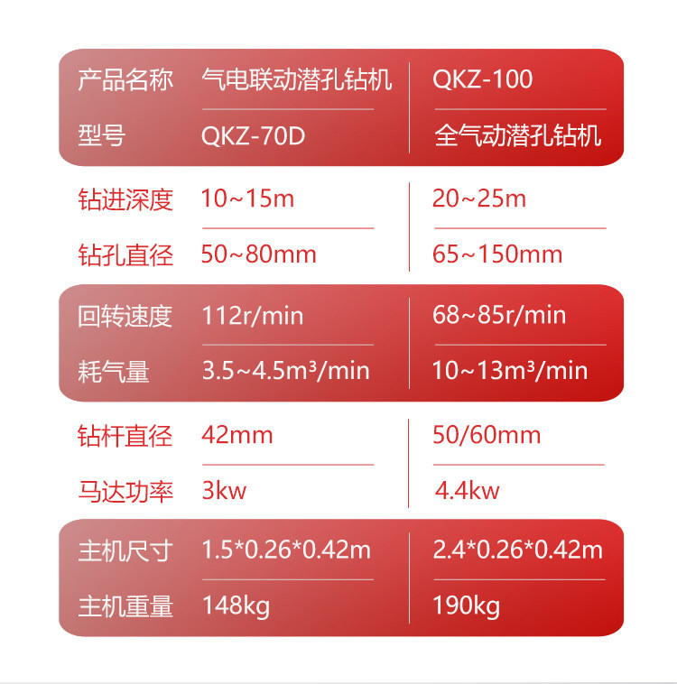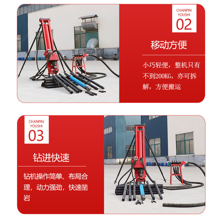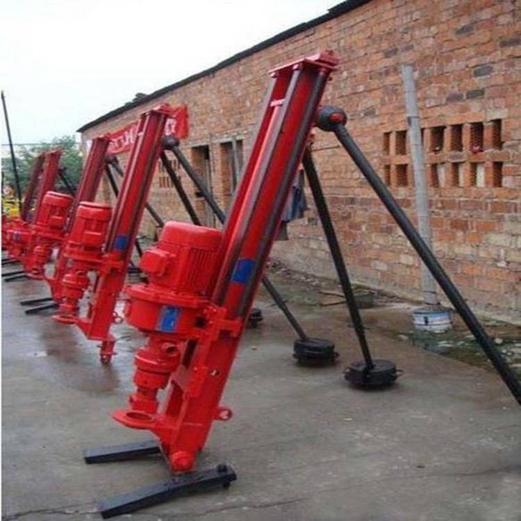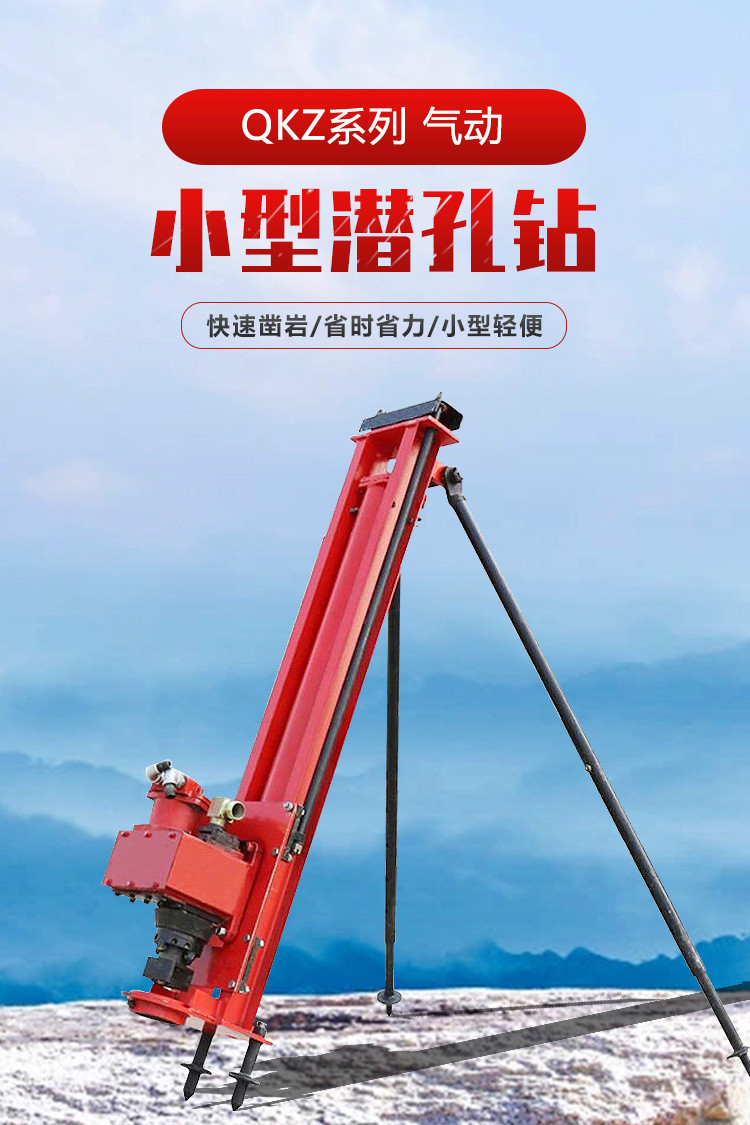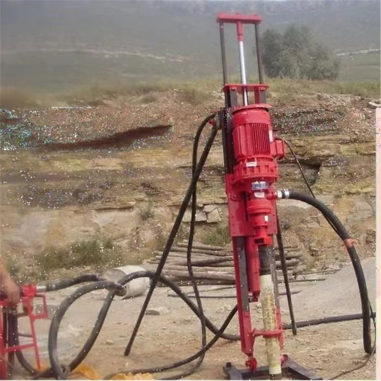 SKB70/100/120型潜孔钻机是我厂自行设计的一种新型、、半机械化的先进凿岩设备。具有结构简单、实用轻便等特点。主要用于井下采矿场接杆钻凿上向扇形或环形中的深炮孔,亦可用于井下空场的放顶和巷道锚杆支护以及需要钻凿类似上述炮孔的石方工程。潜孔钻机技术参数:型号单位潜孔钻机70潜孔钻机80潜孔钻机100潜孔钻机130钻