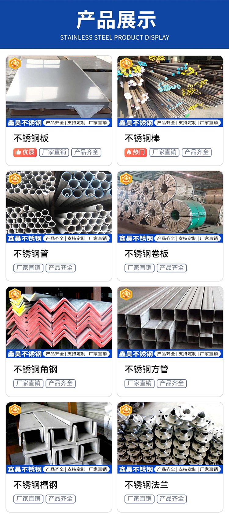 不锈钢板、不锈钢管、不锈钢棒、不锈钢法兰、不锈钢角钢、不锈钢卷材、不锈钢方管