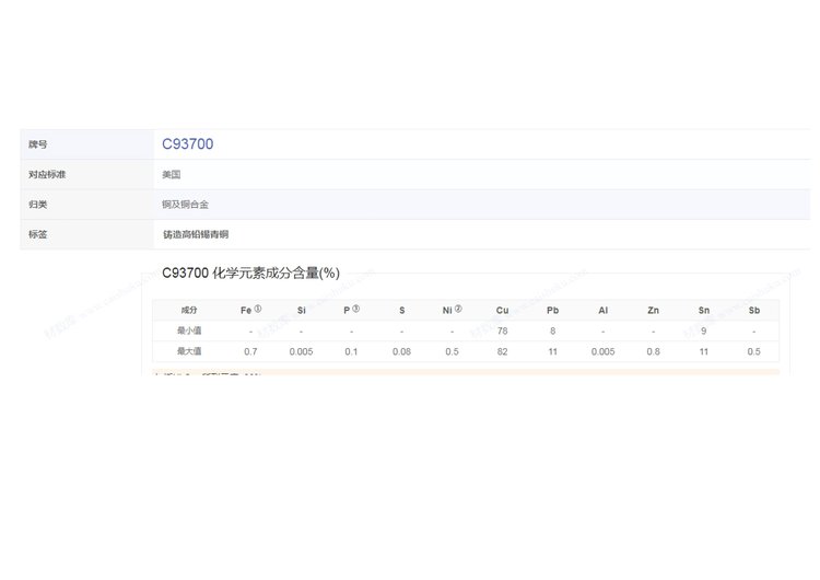 C93200铜合金、CuSn7Zn4Pb7铜合金、CuSn12铜合金、C93700铜合金、CuSn10Pb10铜合金、CuAl10Fe5Ni5铜合金、CuSn7Pb15铜合金