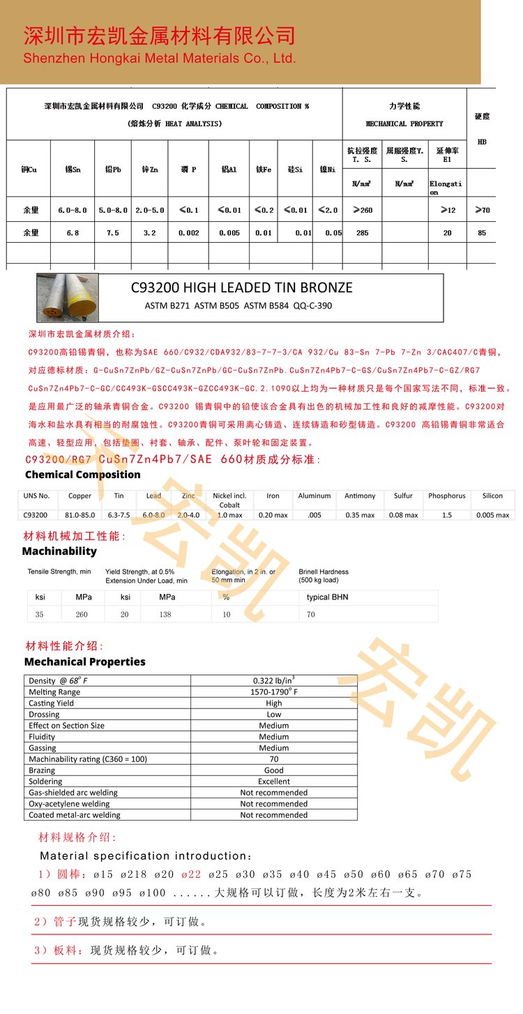 C93200铜合金、CuSn7Zn4Pb7铜合金、CuSn12铜合金、C93700铜合金、CuSn10Pb10铜合金、CuAl10Fe5Ni5铜合金、CuSn7Pb15铜合金
