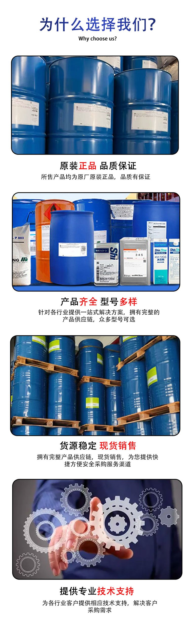 阻燃剂、切削液、塑溶胶、防水蜡、胶黏剂、催化剂、共聚物、吸收剂、聚合物、导电剂、哑光粉、增进剂、荧光粉、司巴隆、乳胶漆、清洗剂、聚酰胺、铁酸锌、冷却液、珠光粉、偶合剂、防锈剂、稀释剂、白碳黑、化妆品