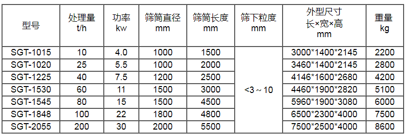 注:1、以上参数以滚筒筛分机给料**<200mm,平均粒径在80mm左右的物料为依据。