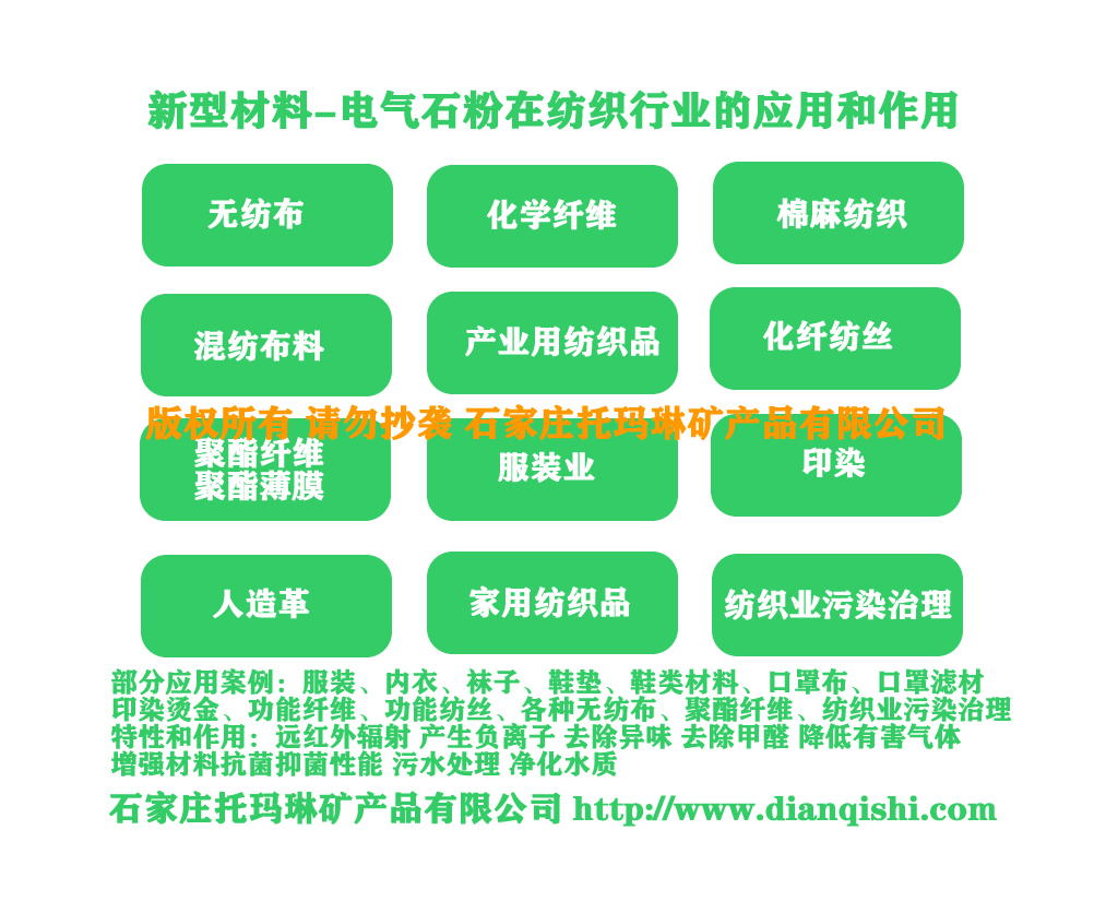﹡电气石粉用于纺织行业,可做环保炭布,超细电气石粉制成超细纤维,可制成防磁、防潮、保暖棉被、棉垫、防电磁辐射衬衫、背心、鞋垫等。