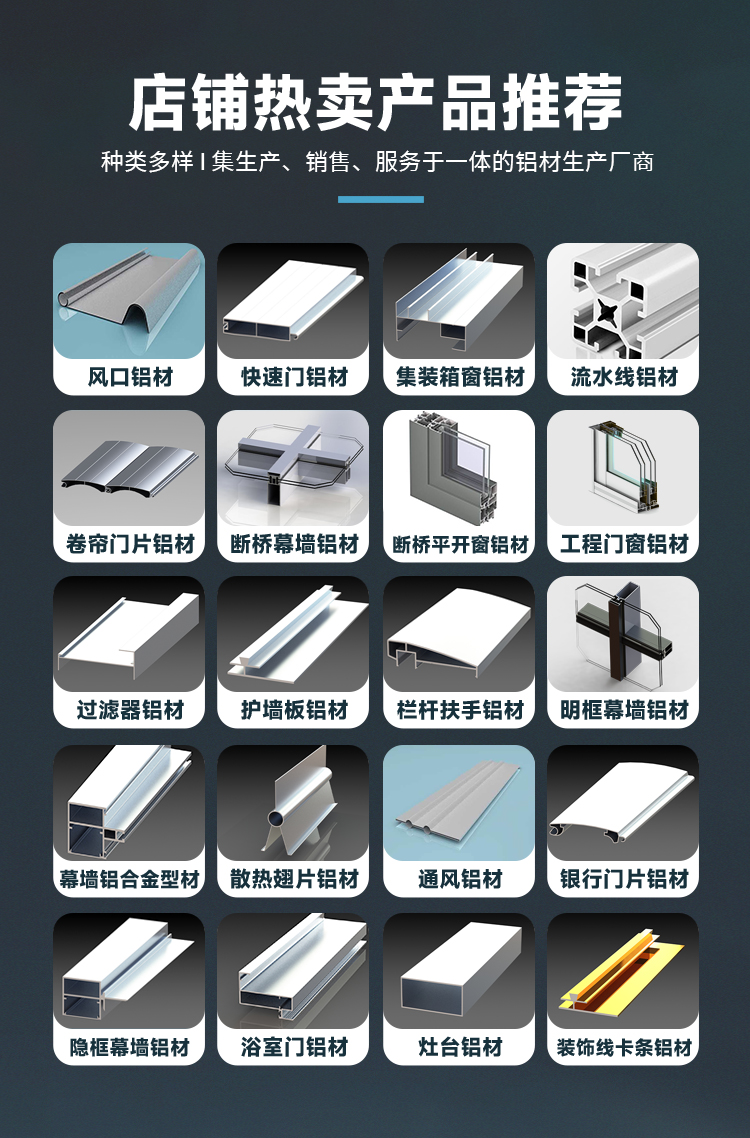 铝型材、地弹门、地门料、铝方管、铝圆管、直铝管、铝线条、铝合金、铝方通、收边条、长条灯、断桥铝、线条灯、平开门、配套窗、平开窗、散热器、铝格栅、铝矩管、卷帘门片、建筑幕墙、净化铝材、幕墙铝材、工业铝材、异形铝材