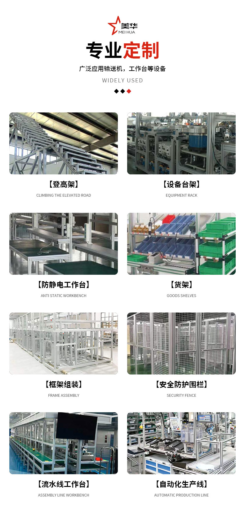 工业铝型材、防静电工作台、工业机器人围栏、流水线、组装线、自动化生产线