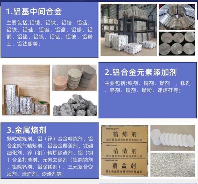 打渣剂、速熔硅、钎焊剂、冰晶石、炒渣剂、锌合金、铝合金、清炉剂、精炼剂、be3国标、铝稀土、变质剂、膨润土、be5国标、铝钛硼、合金y10、钛合金、除渣剂、覆盖剂、清渣剂、锰合金、合金铝锶、冶铸煤粉、喷吹煤粉、专用煤粉
