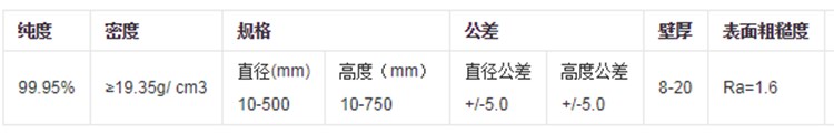 纯度:W≥99.95% , 密度:≥18.5g/cm3, 应用温度环境:2400℃。