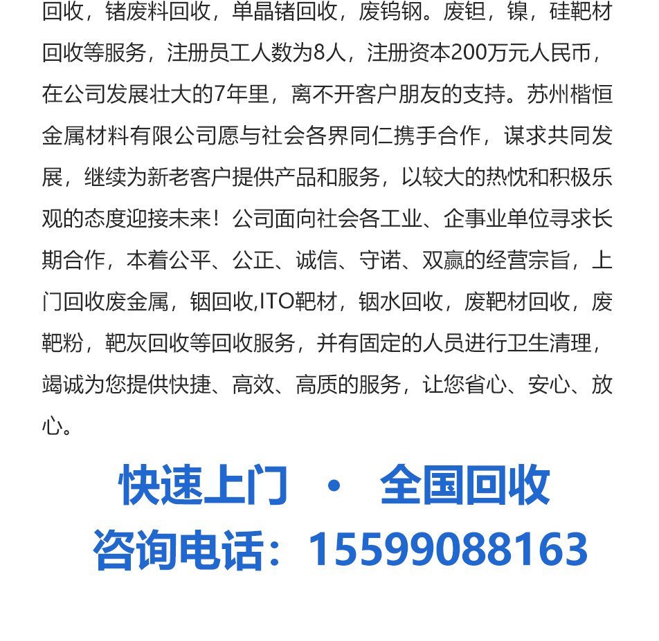 靶材废、高速钢、金刚线、金属铍、锗棒废、烟筒料、铟丝珠、锡膏废、铟上门、镍回收、硅管废、铟金属、回收ito、废金属、铟废料、钼靶材、废铜板、废锡线、钽靶材、山铟废、铟合金、ito颗粒、收购镍、化铟锡、钼管废