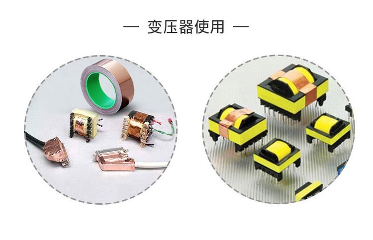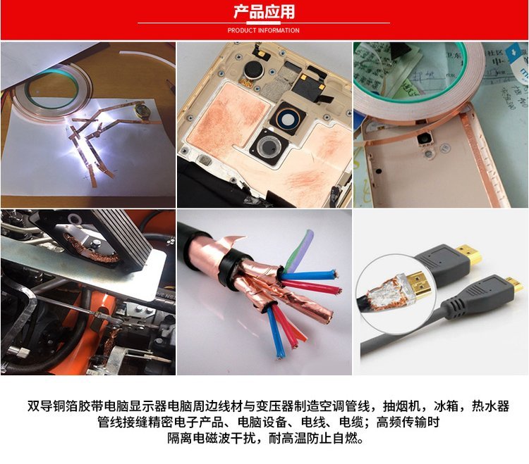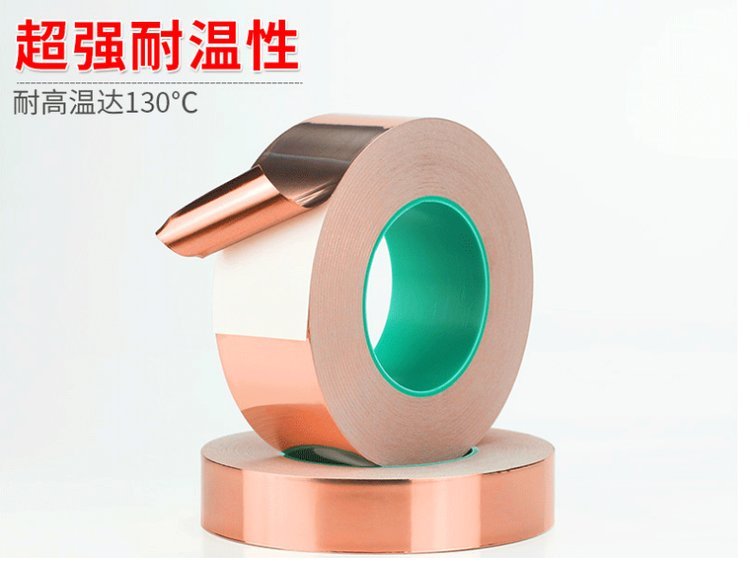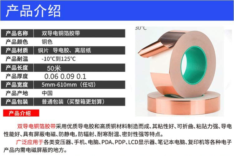 双导铜箔;基材:铜箔,传导压克力胶,粘性好,附着力强。性能:具有保温,隔热,防水,粘力佳,耐寒性好,易撕,可消除电磁干扰(EMI),隔离电磁波对人体的危害,避免电压或电流影响功能,主要用于电脑显示器电脑周边线材与变压器制造中央空调管线,抽烟机,冰箱,热水器等的管线接缝, 电子产品、电脑设备、电线、电缆等;高频传输时,隔离电磁波干扰, 防止自燃,规格:(0.018mm-0.095mm)各种厚度,宽度可任意分切。