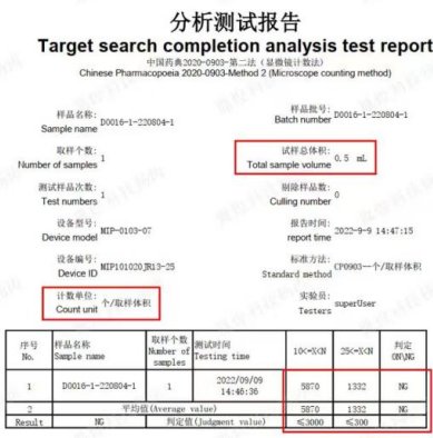 与光阻法结果对比,结果显著低于显微计数法,这也证实了光阻法会因样本颜色干扰而严重低估微粒数量,存在假阴性风险。基于显微计数法的结果,批次样本应判定不合格,需立即启动偏差调查程序,排查生产、灌装及过滤环节可能引入微粒的因素。同时,应对原辅料及包装材料进行微粒污染监测,评估滤材完整性及设备清洁状态。