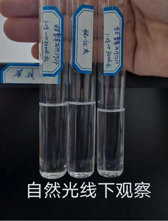 在25度室温下,精密称量原料甜菊素1.0g加纯化水30ml,混匀静置5分钟后在照度1000Lx的自然光观察。如下图