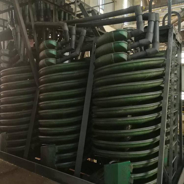 玻璃钢螺旋溜槽由给矿匀分器、给矿槽、螺旋槽,产品截取槽、产品集聚斗和槽支架(包括十字架或三角架)等六部分组成。由螺旋片联接成的螺旋槽是主要部件。螺旋片是由玻璃钢(玻璃纤维增强塑料)制成,借螺栓接在一起,螺旋槽的选别面有一层预制的耐磨层。它具有质轻、坚固。螺旋槽的上方设有多管给矿匀分器分矿均匀,控制简便。分矿器自由放置在支桌的十字架(或三角架)上。均分的矿浆通过装在螺旋槽首端的给矿槽缓慢地给到螺旋槽面上,进行分选。螺旋槽的尾端装在有阀块式新产品截取槽将分选的新产品沿径向按品位分成三种(或四种)新产品。用调节阀块的位置来改变各新产品的截取宽度。新产品集聚斗是一同心环形筒,将已截取的多头矿流分别汇集导出。螺旋溜槽的横截面,曲线的斜率变化特别适于细微粒物料的选别。螺旋溜槽具有结构简单、无运动件、重量轻、元噪音、配置安装和维修方便等。