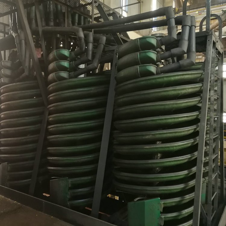 6、螺旋溜槽给矿后还应注意其矿流是否布满整个螺旋槽面,若发现矿流有靠外的现象则必须设法(如水冲等)纠正。