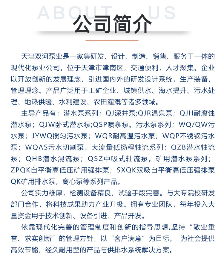 潜水泵、深井泵、浮筒泵、卧式潜水泵、潜水轴流泵、矿用潜水泵、污水泵、潜油电泵、热水泵、双吸泵、永磁泵、防汛泵车、管中泵、管道离心泵、漂浮泵、下吸式潜水泵、中吸泵、化工泵