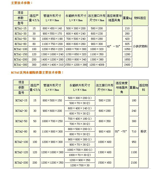 详细信息 RCYA(1)、RCYA(2)、系列管道永磁除铁器包括无磁管道和永磁铁两部分,专用于对封闭管道内非磁性物料的除铁,永磁的除铁器内部采用高性能的硬磁材料组成复合磁系。具有体积小、磁力大、重量轻、除铁干净、方便、无能耗、使用寿命长等特点。适合没有输送皮带,只能提供下料溜槽的场合。当散装物料经过管道式永磁铁除铁器时,铁杂物被高场强的永磁铁所吸附,清除铁杂质时,打开管道专用门将杂质取除。主要应用与水泥、化工、塑料、耐火材料、建材等行业的下料管道中清除杂物。