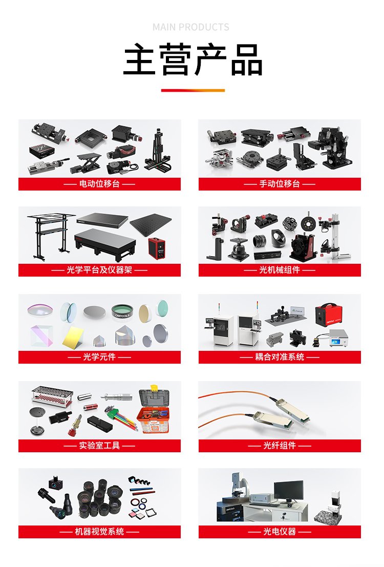 电动位移台、手动位移台、平移台、升降台、旋转台、角位台、直线电机平台、光学平台、隔振光学平台、气浮平台、隔振平台、光学平台仪器架、芯片级自动耦合系统、硅光模块自动耦合系统、PLC自动耦合设备
