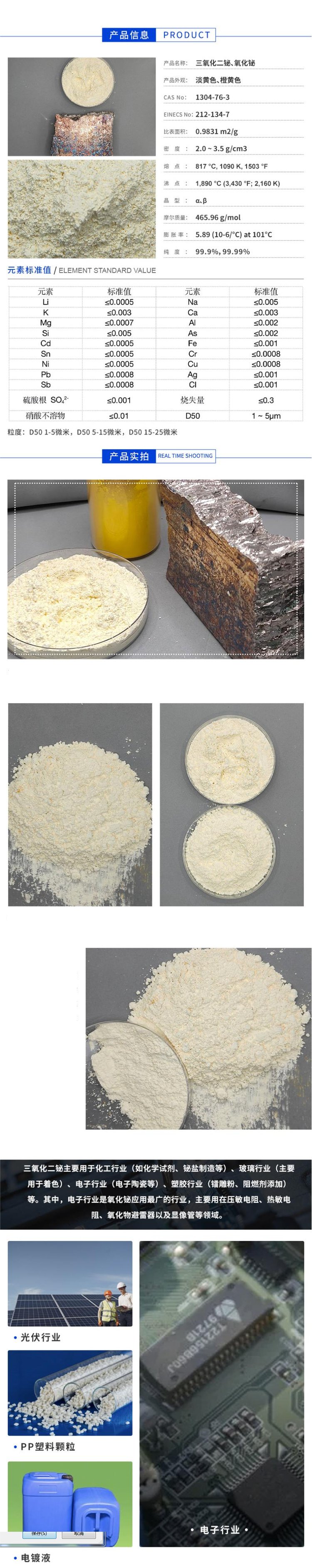 优等品氧化铋 高纯度99.9% 玻璃着色 压敏电阻 陶瓷电容 cas1304-76-3