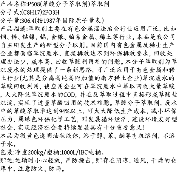 P508萃取剂 用于有色金属湿法冶金行业 铜锌钴镍镉金银铂系金属 稀土