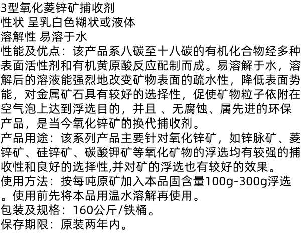 3型氧化菱锌矿捕收剂 降低矿物表面势能 锌脉矿 菱锌矿 硅锌矿适用