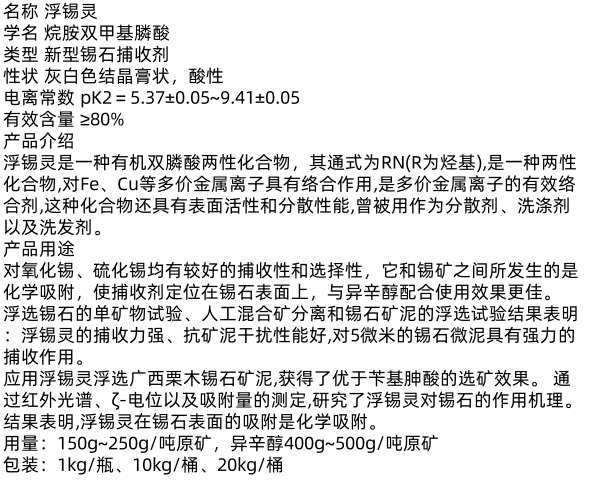 浮锡灵、铜萃取剂、乙硫氨酯、氧化石蜡皂、铜矿活化剂、硫化锡矿石、苯乙烯膦酸、稀土矿捕收剂、锡石细泥捕收剂、国标二号浮选油