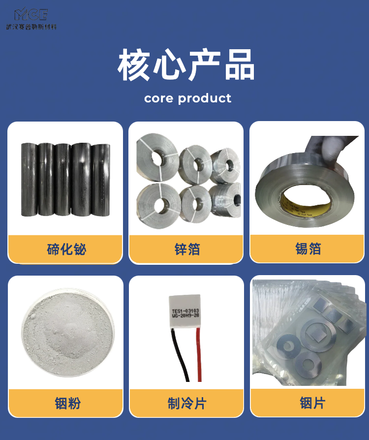 碲化铋、锌箔、碲化铋晶棒、氧化碲、砷酸锂、碲化铟、金属镓、碲化铋粉末、硒化钨、碲化锡、碲化银、醋酸镧、碲化铜、碲化镍、硒化铟、碲化锌、碘化亚锡、二碘化锡、电子元件、砷化铟块、半导体材料、单晶棒颗粒、二硒化钛粉末、硒化亚锡粉末