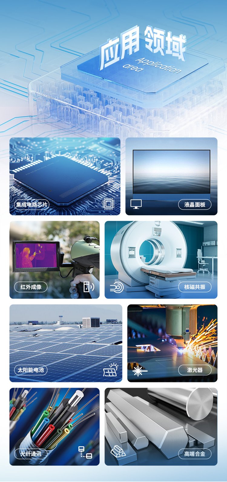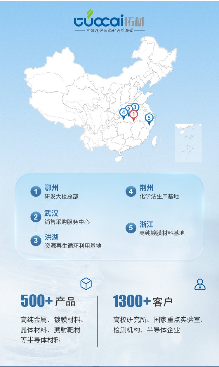 7n5锑棒、高纯铟、7n8n镉棒、高纯碲块、氧化铟、7n5砷棒、氧化镓、氧化铋、氧化物、高纯铝、高纯磷、锑化铟、氧化锑、碲化铋、催化剂、镀膜材料、碲锌镉、金属铜、氧化钪、红外材料、二氧化锗、高纯碲丸、二氧化硅、高纯碲锭、金属颗粒