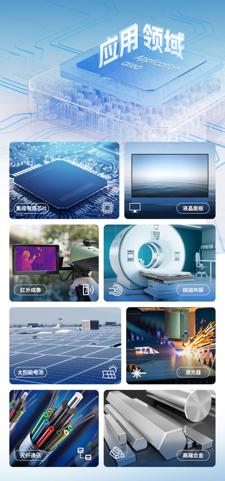 7n5锑棒、高纯铟、7n8n镉棒、高纯碲块、氧化铟、7n5砷棒、氧化镓、氧化铋、氧化物、高纯铝、高纯磷、锑化铟、氧化锑、碲化铋、催化剂、镀膜材料、碲锌镉、金属铜、氧化钪、红外材料、二氧化锗、高纯碲丸、二氧化硅、高纯碲锭、金属颗粒
