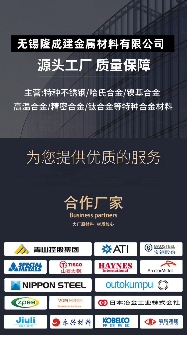镍基合金、哈氏合金、高温合金、蒙乃尔合金、钛合金、铜镍合金、双相钢、沉淀硬化钢、耐热钢铸件、圆钢、钢板、无缝管、纯镍板、不锈钢