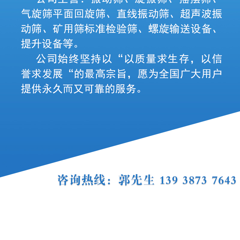 输送机、浆液过滤筛、高频脱水筛、无轴滚筒筛、振动筛分机、标准检验筛、超声波振动筛、不锈钢筛分机、矿用振动脱水筛、输送斗式提升机