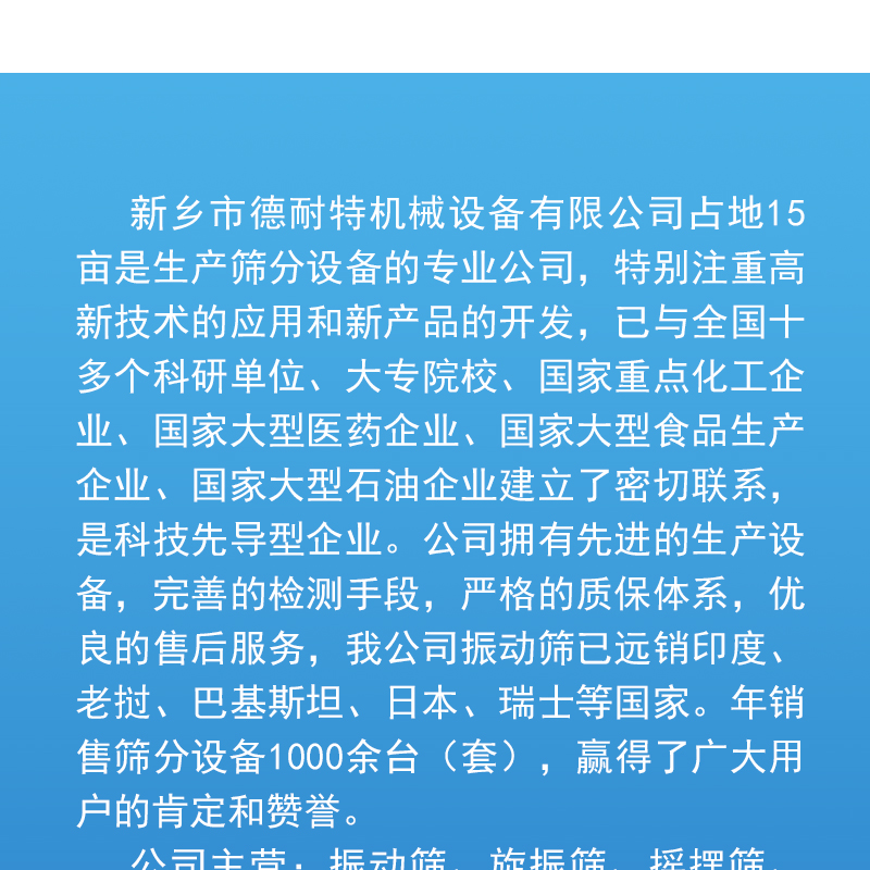 输送机、浆液过滤筛、高频脱水筛、无轴滚筒筛、振动筛分机、标准检验筛、超声波振动筛、不锈钢筛分机、矿用振动脱水筛、输送斗式提升机