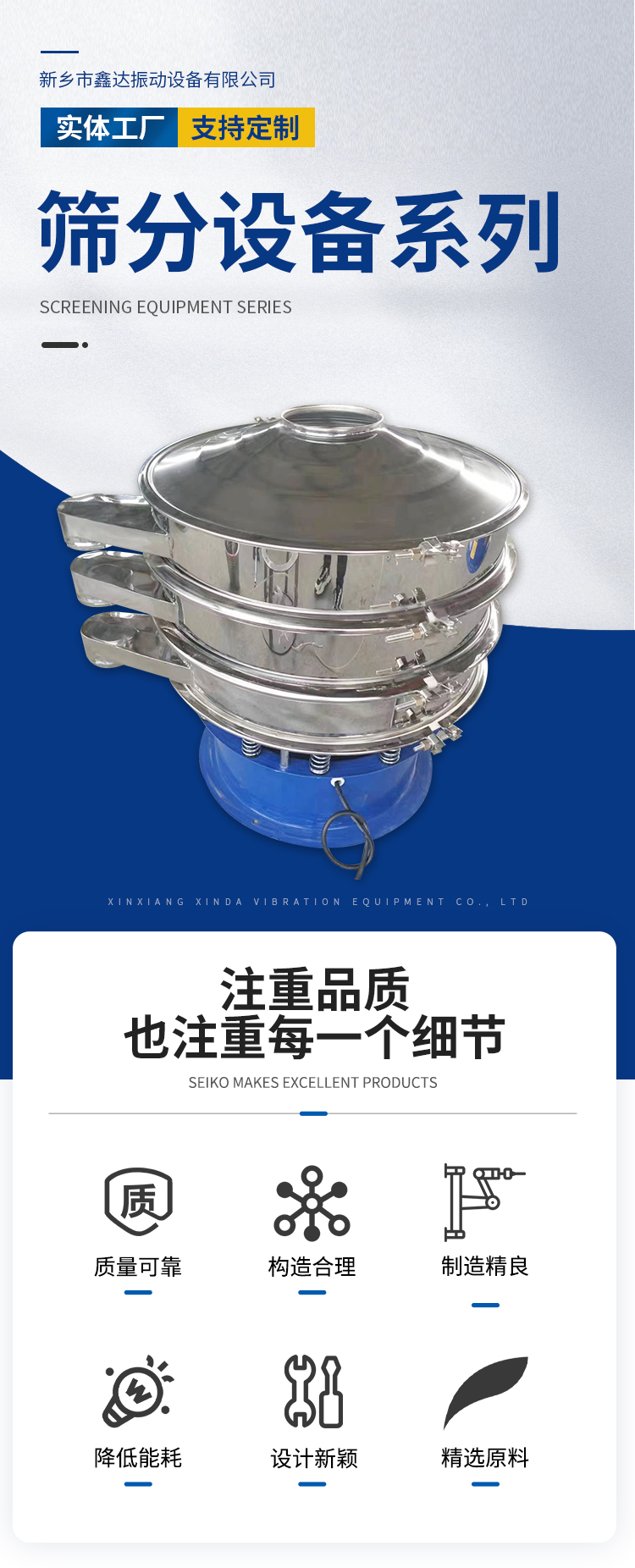 豆浆过滤机、多层直线筛、石英砂振动筛、方型摇摆筛、圆形摇摆筛、旋振筛、不锈钢振动筛、斗式提升机、振动给料机、木制筛框