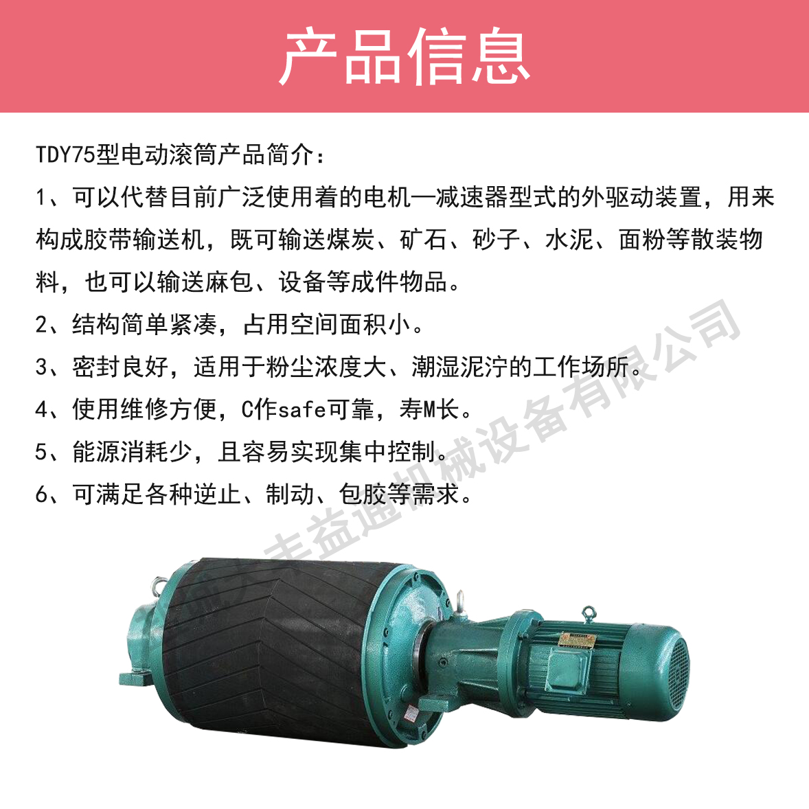 空气压缩机、电液推杆、电动推杆、电液动犁式卸料器、中高压空压机、电液动 推杆、液压调偏装置、冷却器、电动滚筒、卸灰阀、分散机、犁煤器、干油泵黄油泵、防溢裙板、防尘帘、夹持器、清扫器、矿山设备、皮带输送设备、DYTZ电液推杆、DYTP电液推杆、DYTZ电液推杆、DT电动推杆、补偿器、暖风机