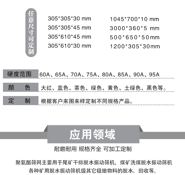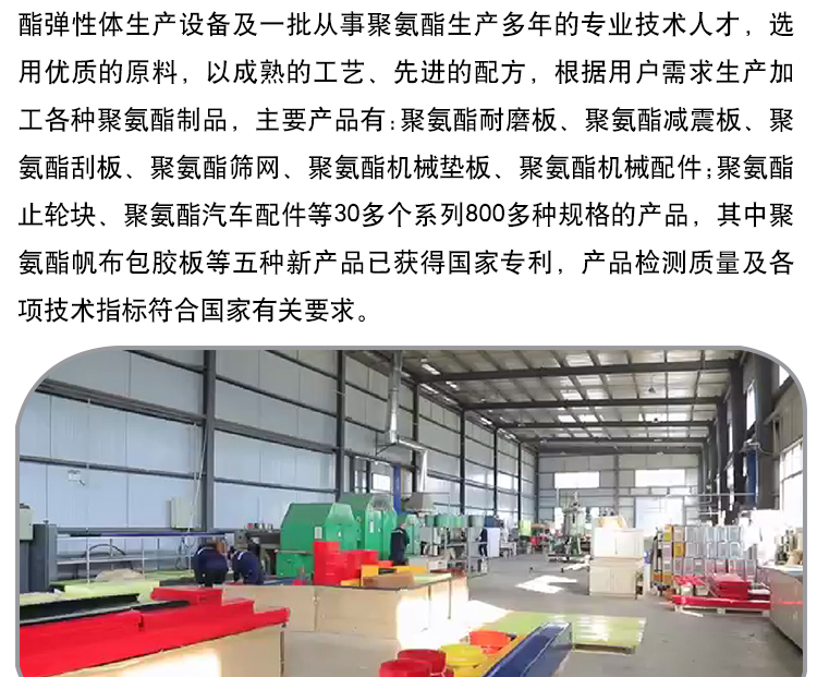 叉车轮、绳锯机、导线轮、刮煤板、刮水板、档车块、定制板、减震板、耐磨板、耐磨条、传动轮、挡车板、后导轮、雨篦子、阻胎器、聚氨酯、止滑块、清扫器、搅拌块、方向盘、定位器、细筛网、防滑块、耐油板、万向轮