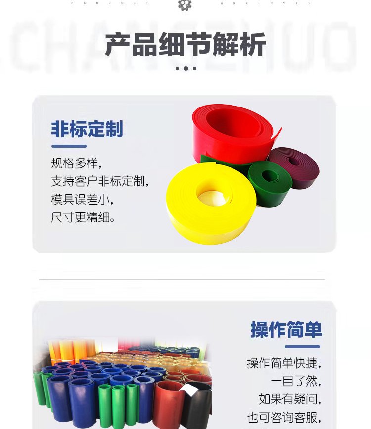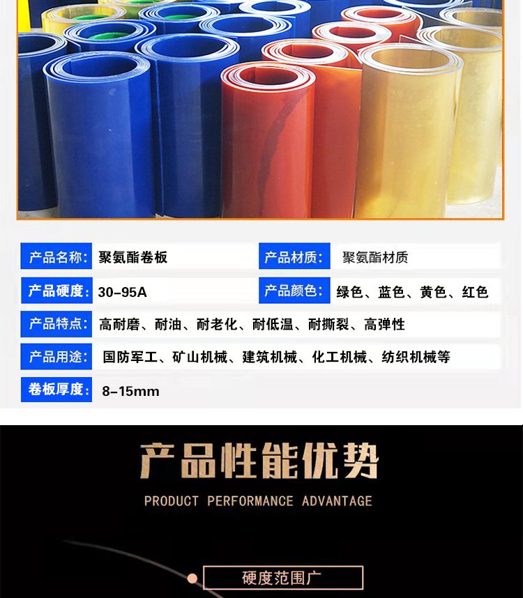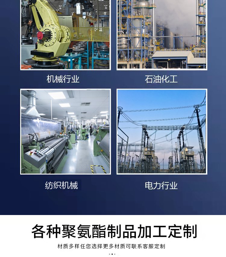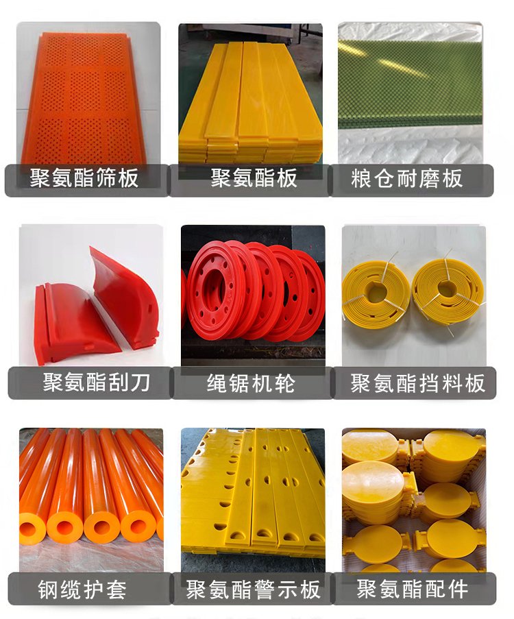 叉车轮、绳锯机、导线轮、刮煤板、刮水板、档车块、定制板、减震板、耐磨板、耐磨条、传动轮、挡车板、后导轮、雨篦子、阻胎器、聚氨酯、止滑块、清扫器、搅拌块、方向盘、定位器、细筛网、防滑块、耐油板、万向轮